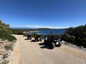 Nakon kave, čaja i doručka, oko 9 sati krećemo na avanturu s quadovima prema jugu otoka (Mrtvaškoj). Put vodi vijugavim stazama po najvišim vrhovima otoka, uz stajanja na vidikovcima, poput sv. Ivana. Spuštamo se do uvale Plieski, gdje ćemo se osvježiti kupanjem. Tijekom dana osigurani su lunch paketi za ručak. Nakon povratka u kamp, slijedi prijevoz gostiju do grada na večeru po izboru.