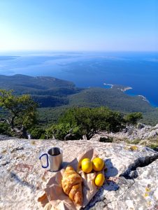 Nakon kave i čaja, krećemo kombijem prema planini Osorčici na otoku Cresu, uz kratku stanku u obližnjoj pekari ili trgovini za kupovinu laganog doručka. Planinarenje na Osorčicu (557 m n.v.) započinje, a tijekom uspona planirane su pauze na zanimljivim mjestima za odmor, slikanje i kušanje domaćih kobasica, sira i voća. Nakon planinarenja, slijedi kupanje na jednoj od divljih plaža otoka Cresa. Povratak u kamp s večerom predviđen je za večernje sate.