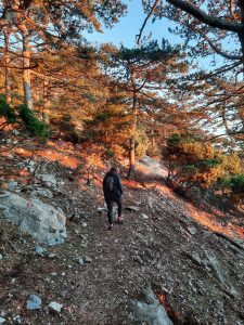 Nakon kave i čaja, krećemo kombijem prema planini Osorčici na otoku Cresu, uz kratku stanku u obližnjoj pekari ili trgovini za kupovinu laganog doručka. Planinarenje na Osorčicu (557 m n.v.) započinje, a tijekom uspona planirane su pauze na zanimljivim mjestima za odmor, slikanje i kušanje domaćih kobasica, sira i voća. Nakon planinarenja, slijedi kupanje na jednoj od divljih plaža otoka Cresa. Povratak u kamp s večerom predviđen je za večernje sate.